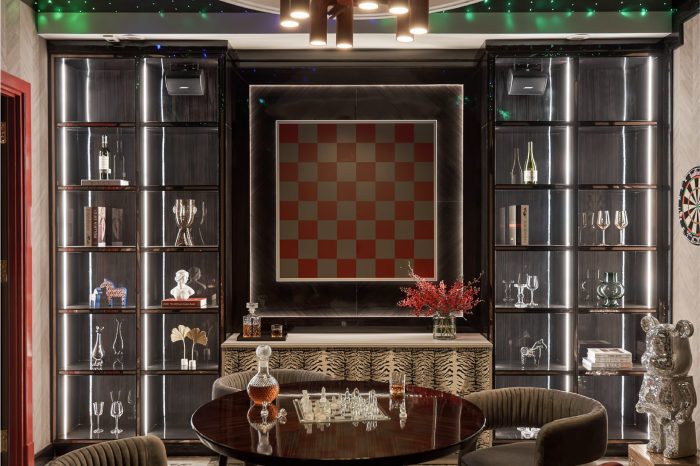 Phòng karaoke và chiếu phim được trang bị dàn âm thanh Bose & Electrovoice hiện đại và đảm bảo trải nghiệm âm thanh hình ảnh tuyệt vời nhất. Bộ sofa chữ U của phòng này tạo chỗ ngồi thoải mái cho nhóm bạn, gia đình, và cả khách và đối tác cũng có thể tận hưởng không gian giải trí sang trọng này. Đặc biệt phòng giải trí có mảng trần ánh sao, cũng là thiết kế trần xuyên suốt cho các phòng ngủ của gia đình.