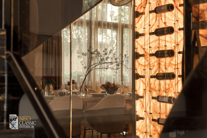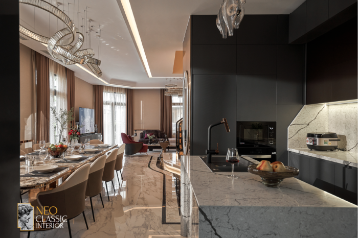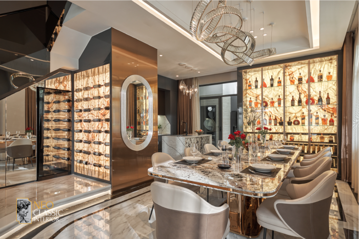 Lắng nghe nhu cầu về thẩm mỹ của gia chủ về một không gian sống đáp ứng phong cách sống mới thời thượng và đẳng cấp, đồng thời không thể thiếu yếu tố tiện nghi hiện đại, NEO Classic lựa chọn phong cách thiết kế Modern Luxury cho căn biệt thự góc Verosa Park. Với lợi thế là căn góc, căn biệt thự đón ánh sáng tự nhiên từ 2 mặt tiền giúp duy trì ánh sáng suốt ngày dài và góp phần làm tăng độ tương phản bề mặt vật liệu pha lê, kính và kim loại. Điểm đặc biệt nhất ở phòng khách công trình này là chủ nhân ngôi nhà có niềm yêu thích đặc biệt với rượu, nên chúng tôi đã sử dụng đá xuyên sáng làm nền ở khu trưng bày rượu giúp cho các khu vực này nổi bật hơn và có thể quan sát được ngay từ bên ngoài nhà.