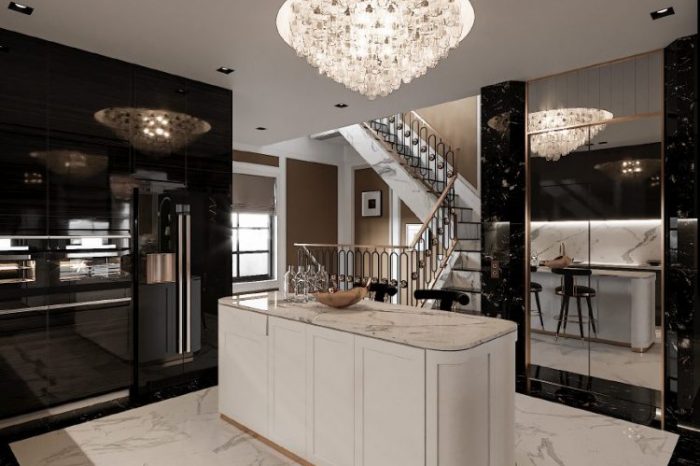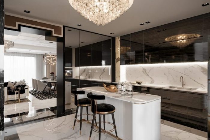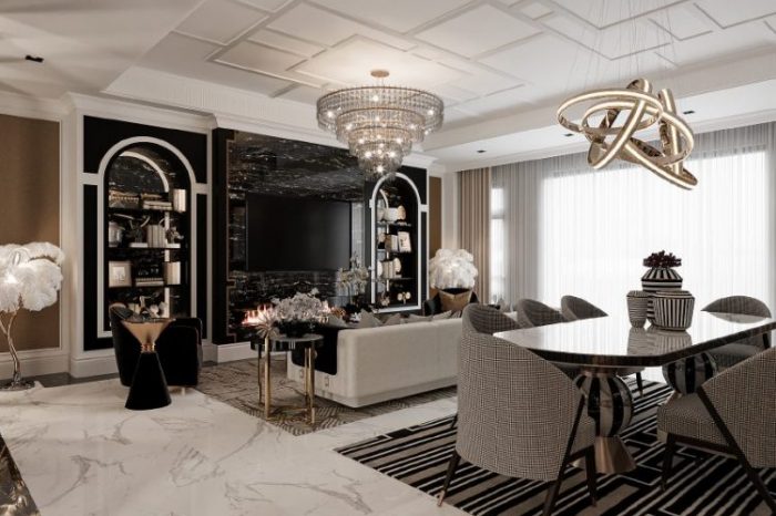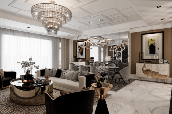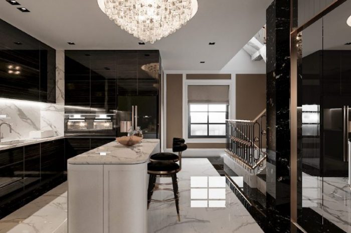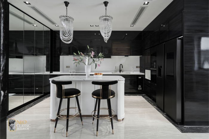Không gian sinh hoạt chung khách – bếp được thiết kế với sự tương phản mà hài hoà màu sắc trắng – đen: sàn, trần, tường tổng thể mang tông trắng để làm nổi bật lên nội thất mang tông đen. Các không gian phòng ngủ được thiết kế với tinh thần nhẹ nhàng, thoải mái hơn, là không gian để nghỉ ngơi và relax cho các thành viên trong gia đình.