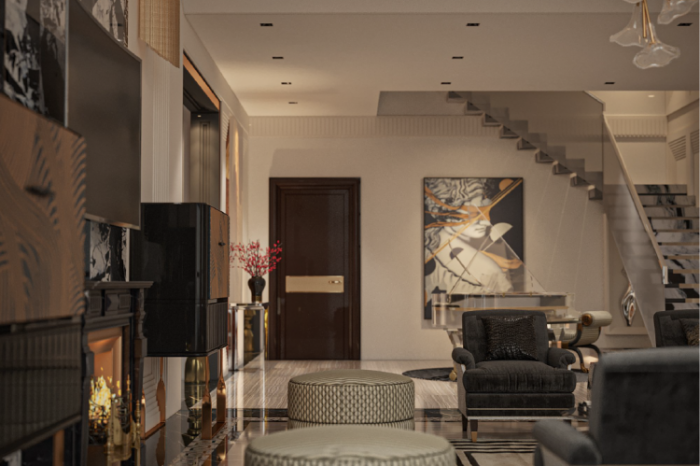 Lựa chọn những chất liệu với bề mặt sang trọng, hiện đại; sử dụng những hình khối, đường nét, hoạ tiết nội thất và decor mạnh mẽ, cá tính. Đặc biệt là 2 màu sắc đen và vàng đồng được sử dụng xuyên suốt và kết hợp hài hoà đã góp phần hoàn thiện một không gian nội thất mạch lạc, thống nhất trong một ngôn ngữ thiết kế.